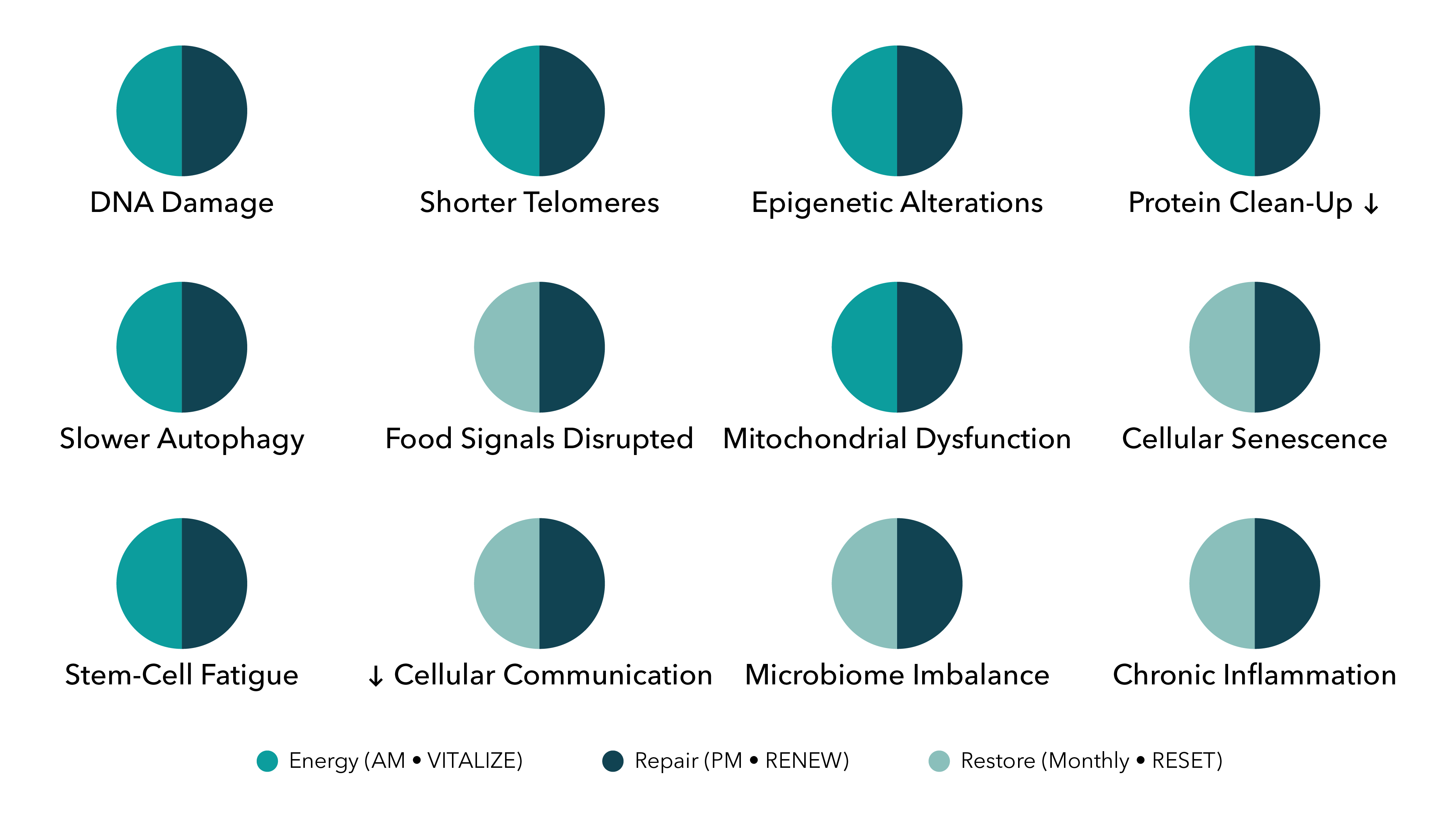 CELLARO’s Core Longevity System is designed around these three levers to cover all 12 hallmarks—complete coverage without double-dosing.