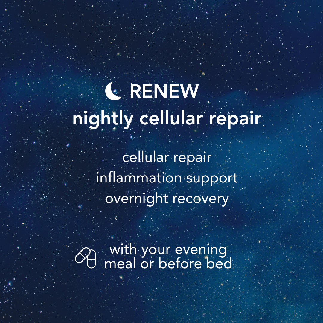 Night-time RENEW aligns autophagy, mitochondrial maintenance, and antioxidant defense with your sleep window so repair can finish.
