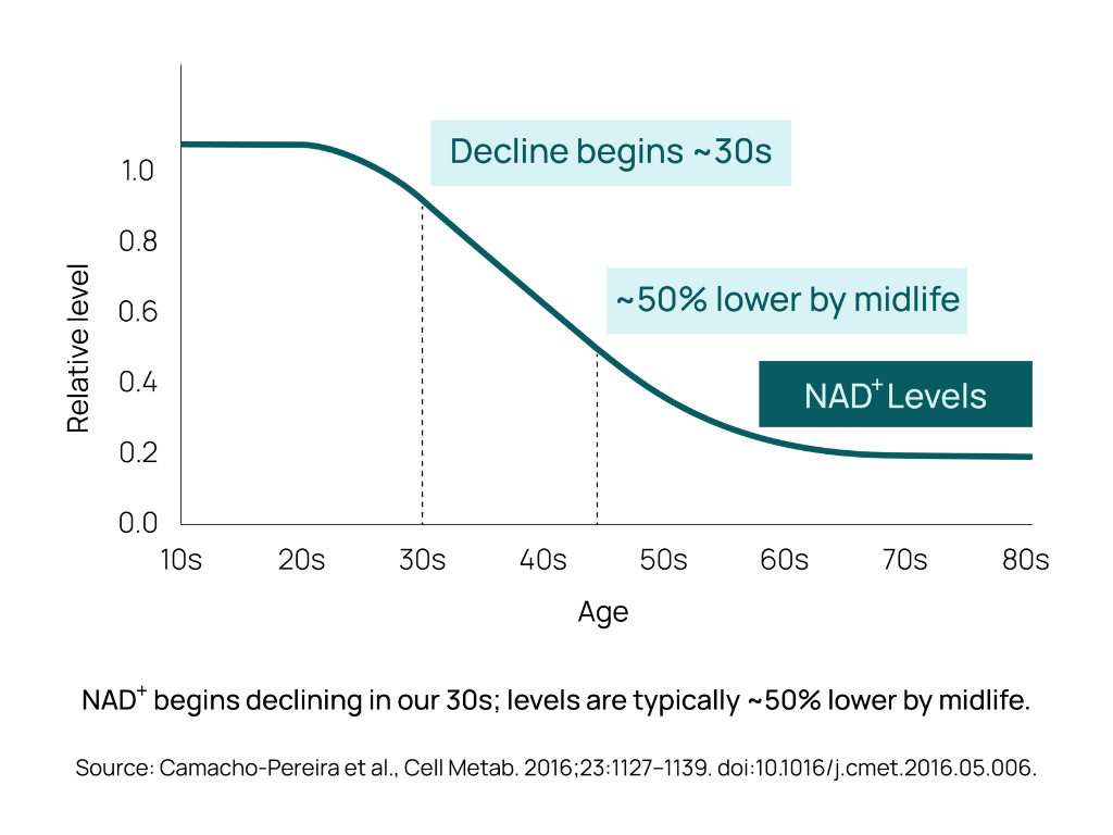 From your 30s, NAD⁺ levels tend to fall; by midlife they can be roughly 50% lower than in youth. With a smaller reserve, your cells have less flexibility — more trade-offs between getting you through the day and completing deeper repair at night. Over time, that underfunded repair quietly adds to cellular strain.